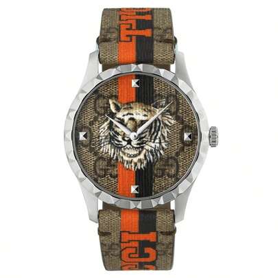 Gucci Women's Fashion Tiger Dial Watch - Casual Canvas Strap, Luxury Logo Design, Quartz Wristwatch Suitable For Daily Wear And Parties - Coffee Brown - View 1