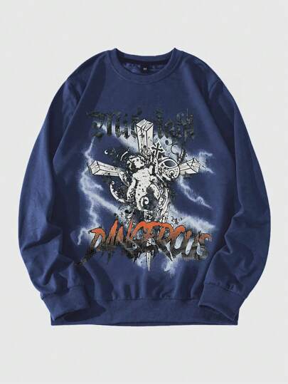 ROMWE MEN Goth Guys Letter & Figure Graphic Sweatshirt - Blue - View 1