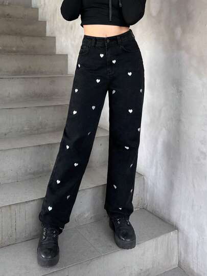 RueChic HIGH WAIST NORMAL STRAIGHT LEG HEART EMBROIDED JEAN - Black - View 1