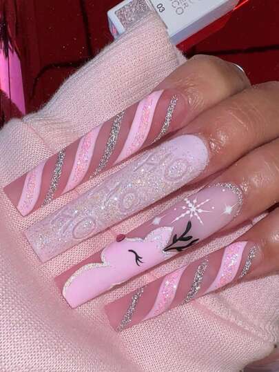 HO! HO! HO! Get Glamorous with 24pcs Long Square Press on nails Christmas nails Pink Deer Fall/winter Nail Silver Pink Striped Snowflake Fake Nail - Multicolor - View 6