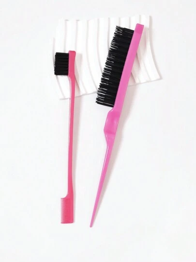 Hair Brush Set, 2pcs, Teasing Brush & Dual-Sided Edge Brush, Used For Edge & Back Brushing, Smoothing Hair Comb - Hot Pink - View 1