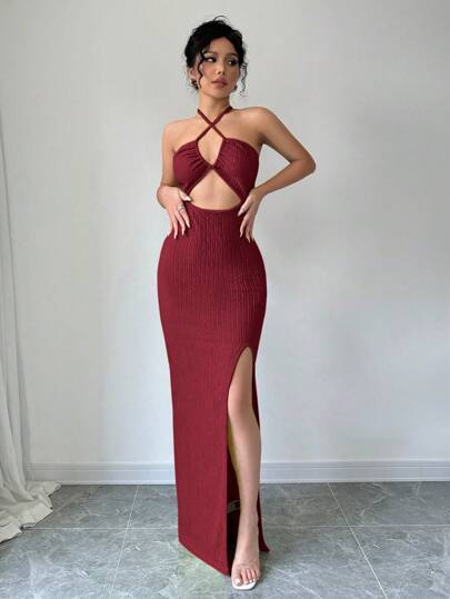 Chiquease Halter Neck Cutout High Slit Bodycon Dress For New Year Clothes Maxi Women Outfit - Burgundy - View 1