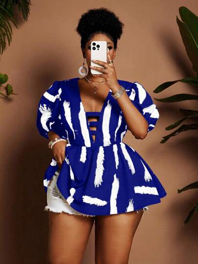 Maweii Plus Size V-Neck Puff Sleeve Printed Elegant Blouse - Blue - View 1