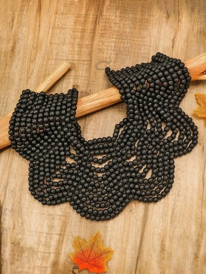 Handmade African Style Wooden Bead Shawl Chain Necklace - Exaggerated Personalized Item, With Intricate Woven Design, Retro Royal Style Women's Jewelry, For Formal And Casual Wear, Beaded Necklace, Elegant Accessory, African Style Design, Handcrafted - Black - View 1
