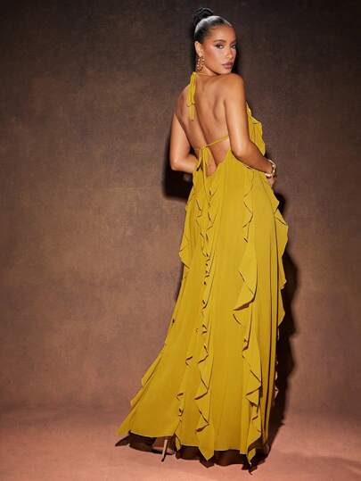 Hauture Sexy Summer Boho Vacation Solid Frill Detail Open Back Maxi Dress - Yellow - View 4