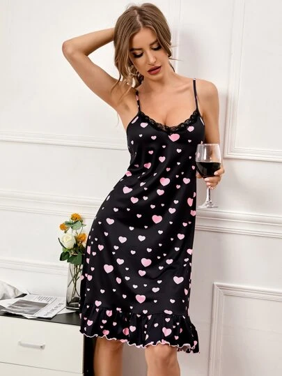 Heart Print Lace Trim Ruffle Hem Cami Sleep Dress - Black - View 1
