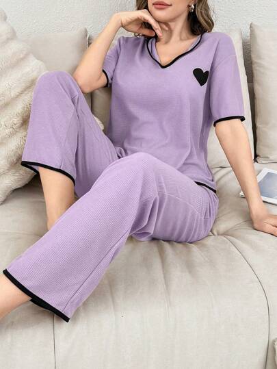 Heart Print Women Casual Pajama Set Outfit - Purple - View 1