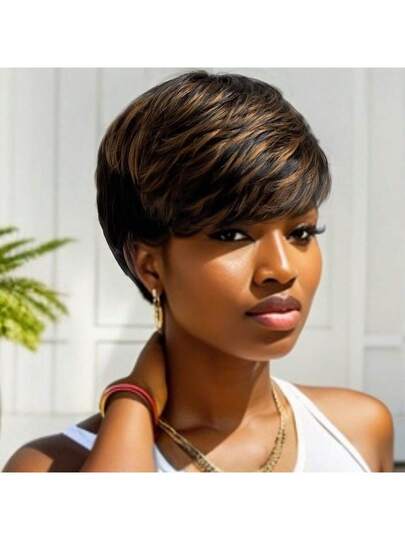 High Light Synthetic Wig Short Straight Pixie Short Bob Wig Honey Blonde Mixed With Black Hair For Ladies - Multicolor - View 1