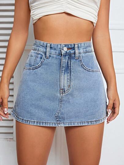 High Waist Denim Skort - Medium Wash - View 1