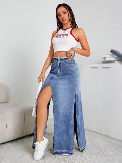 SHEIN EZwear High Waist Split Thigh Denim Skirt - Medium Wash - View 1
