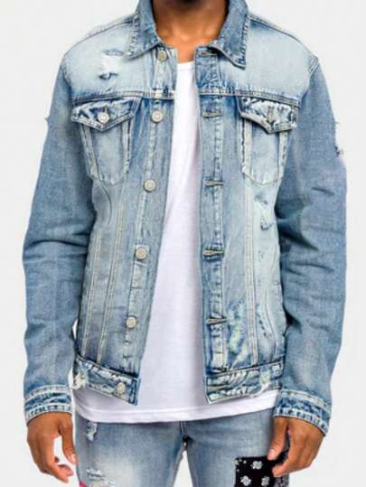 Hip Hop Printed & Embroidered Casual High Street Loose Fit Rock Youth Denim Jacket - Light Wash - View 1