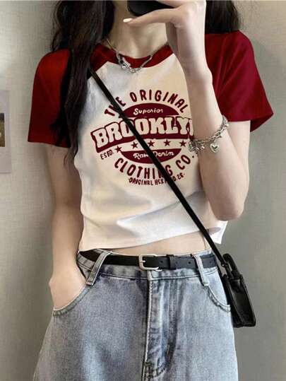 Letter Graphic Raglan Sleeve Crop Tee - Burgundy - View 1