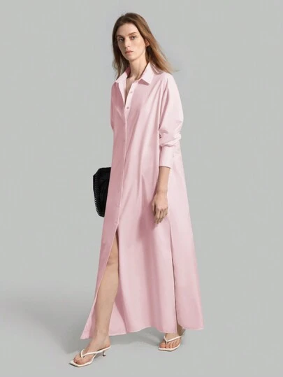 Ontre Women's Solid Color Drop Shoulder Long Sleeve Casual Long Shirt Dress, Spring Summer - Baby Pink - View 1