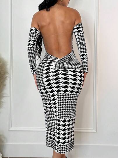 SHEIN SXY Houndstooth Print Off Shoulder Backless Bodycon Dress - Black and White - View 1