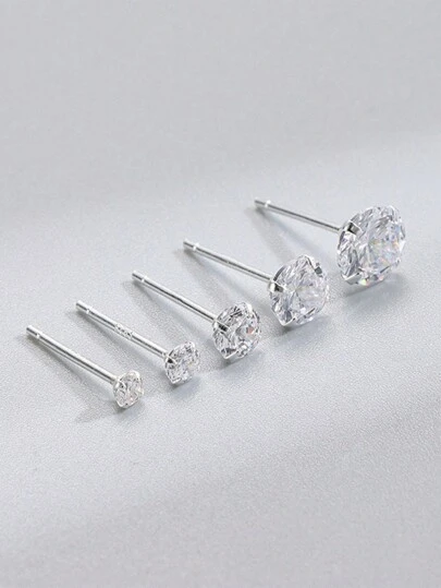HuooNew 1pair Simple 925 Sterling Silver Four-Pronged Small Diamond-Like CZ Stud Earrings, Elegant Jewelry Gift For Teenage Girls - Silver - View 5