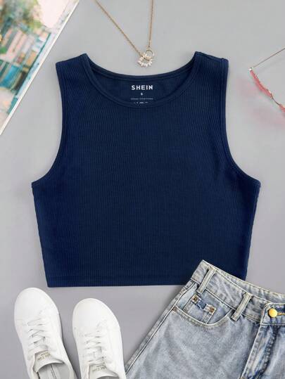 INAWLY Solid Crop Tank Top - Navy Blue - View 1