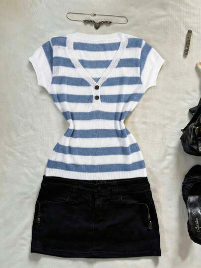INAWLY Striped Waist Cinching V-Neck Casual Knit Versatile Slim Fit Top - Blue and White - View 1