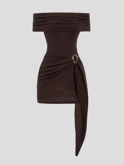 INAWLY Women's Fashionable & Elegant Knitted Textured Fitted Off Shoulder Bell Sleeve Mini Dress With Metal Accessories - Brown - View 1