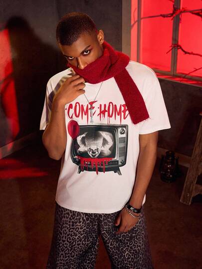 IT x SHEIN Men's Letter & Figure Graphic Round Neck Short Sleeve T-Shirt - White - View 1