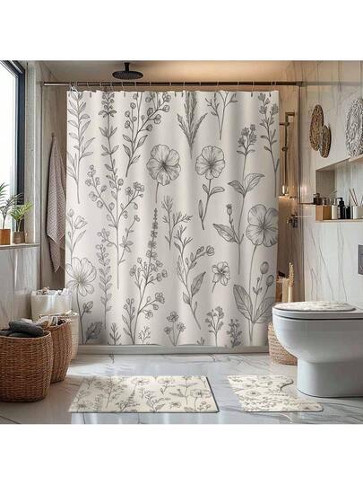 1/4pcs Vintage Floral Bathroom Set, Includes Shower Curtain, Bath Mat, U-Shaped Toilet Lid Cover, Waterproof, Washable, Modern Style Bathroom Divider Curtain, No Drilling Required, Made Of Polyester - Multicolor - View 1