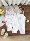 2pcs Baby Outfit, Casual Minimalist Summer New Style, Cherry Pattern Suspender Romper, 2-Piece Color Combination Set, Suitable For Baby Daily Outdoor Wear
