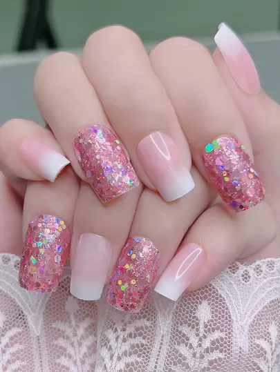 Instantly Upgrade Your Look with 24pcs long square sticky sequins white gradient completely covered fake nails for women and girls - Multicolor - View 5