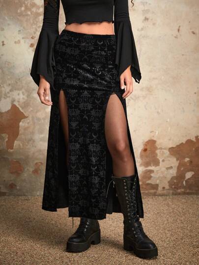 ROMWE Goth Jacquard Split Thigh Skirt - Black - View 1