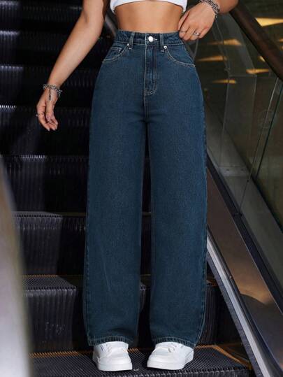 Jeanoix Casual Washed High Waist Straight Leg Jeans - Blue - View 1