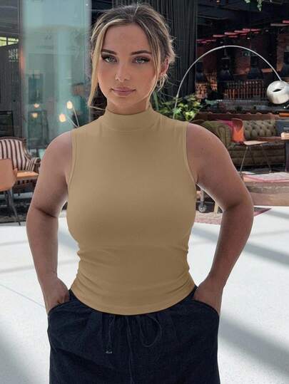 Jeta Ari Women High Neck Bodycon Sleeveless Tank Top Preppy Tops - Khaki - View 1