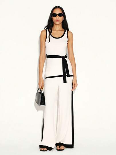 KSTM Women's Knit Co-Ord Set With Contrast Black Trim Tank Top And Wide Leg Pants Two Piece Outfit - Multicolor - View 1