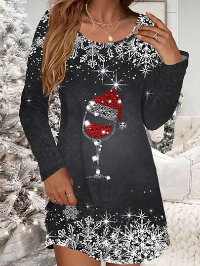 Women's Elegant Wine Glass Printed Christmas Dress, Autumn Winter New Arrival - Grey - View 1