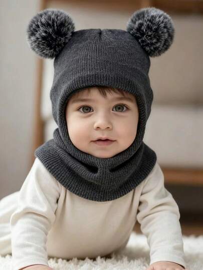 Kids' Double Ball Ear Or Knit Beanie Hat, Warm For Baby Boys & Girls - Dark Grey - View 1