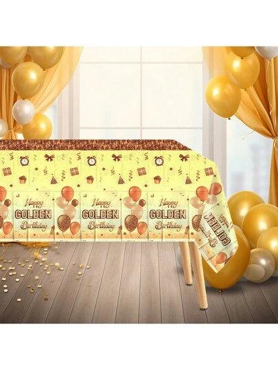 1pc/3pcs Happy Birthday Disposable Plastic Tablecloth With Balloon, Ribbon, Gift, Clock, Bowknot Printing Pattern, Waterproof, Gold Theme Birthday Party Decoration, Suitable For Indoor And Outdoor, Birthday Cake Tabletop Decor - Multicolor - View 1