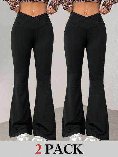 SHEIN PETITE Simple Solid Color Wrap High Elastic Knitted High Waist Flared Pants Pure Black Two-Piece - Black - View 2