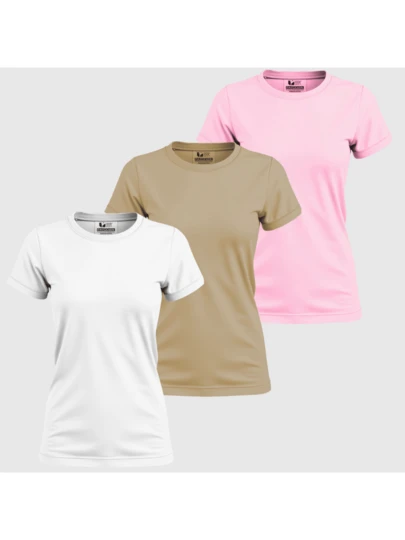 Kit 3 Shirts, T-Shirts, Blouses, Women's Babylook, Cotton, Comfortable, Basic, Plain, Elegant - Pink and Khaki - View 1