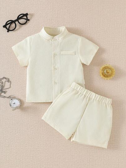 SHEIN 2pcs/Set Toddler Boys' Apricot Short Sleeve Casual Shirt And Shorts Set, Summer - Apricot - View 1