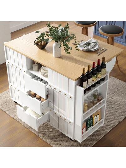 Kitchen Cabinet, Wood Grain Serving Cart, Kitchen Trolley With Wheels And Countertop, Kitchen Trolley With Spice Rack And Towel Rack, Kitchen Island With Sliding Doors And Drawers, White - White + MDF - View 3