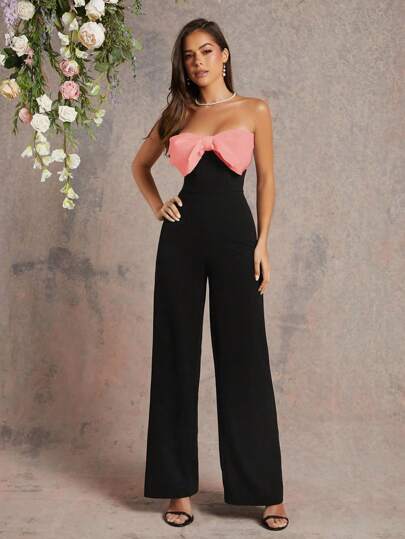 L'Amorae Fall Two-Tone Jumpsuit With Black Bow Top And White Wide-Leg Pants - Red - View 1