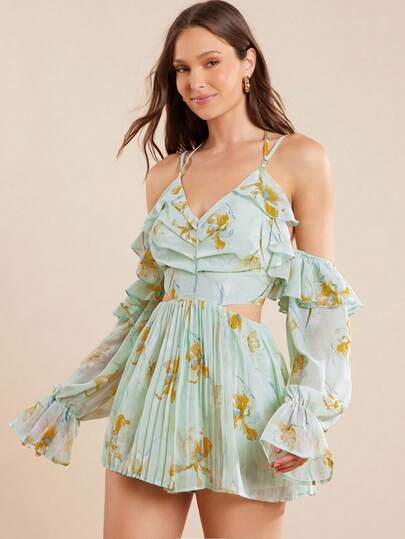 L'Amorae Mint Floral Chiffon Printed Off Shoulder Long Sleeve Romper Spring Summer - Multicolor - View 1