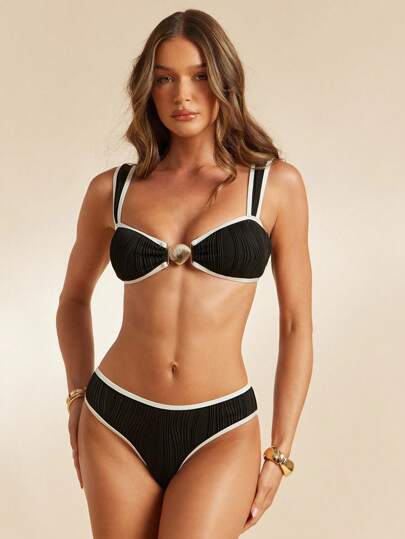 L'Amorae Women's Summer Beach Textured Bikini Bottom - Black and White - View 1