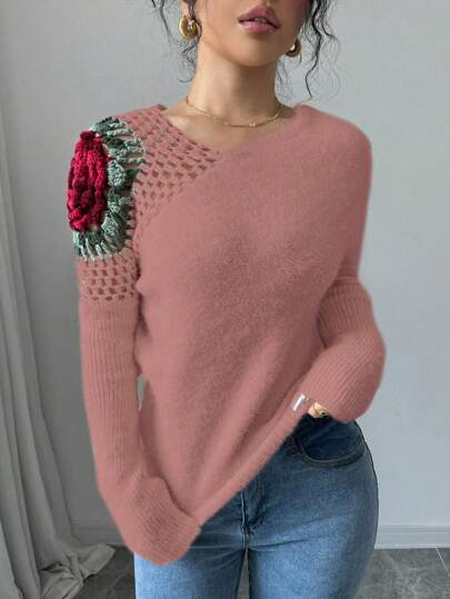 Chiquease Women's Plain Color Patchwork Simple Casual Pullover Sweater Knit Pullover Fall Winter Sweater - Dusty Pink - View 1