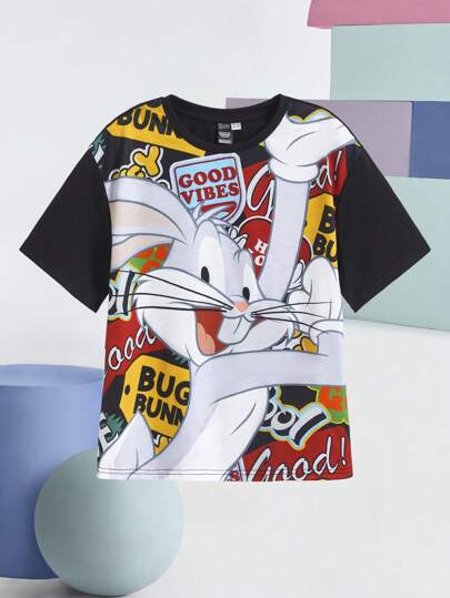 LOONEY TUNES X SHEIN Tween Boy Cartoon Rabbit Print Round Neck Batwing Short Sleeve T-Shirt - Black - View 1