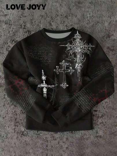 LOVE JOYY Women's Dark Y2K Vintage Cross Logo Graphic Sweatshirt, Comfortable Crew Neck Pullover Suitable For Outings And Gatherings - Black - View 1