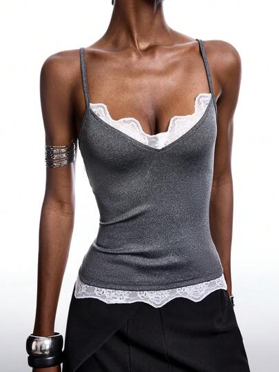 LYSMO 2026 New Arrive Minimalism Spring/Summer Women's Contrast Color Lace Patchwork Camisole Top/ Summer /Women's Summer Set /Summer Outfits /Summer Tops /Spring Outfit Women /Spring/ Spring Break Outfits /Valentine's Day /Valentine Outfits For Women /Birthday Outfits For Women/Going Out Top / Going Out Tops For Women/Elegant Women's Blouses/Casual Blouses For Women/Vacation Outfits Women/Y2k /Y2k Clothes / 2000s Style/ Y2K Tops /Black Top - Dark Grey - View 1