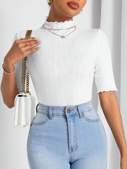 SHEIN Essnce Ladies' Solid Color Half High Neck T-shirt - White - View 1