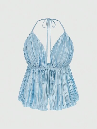 SHEIN Unity Ladies Texture Halterneck Solid Color Drawstring Vacation Simple All-Match Casmisole - Blue - View 1