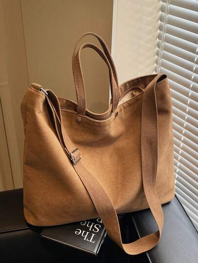 Large Capacity Green Canvas Tote Bag, Minimalist Japanese Style, Suitable For Commuting, Shoulder Strap, Casual, Versatile, Fits Daily Use, Office, School, Shopping, Suitable For Women, College Students, Young Professionals - Brown - View 1