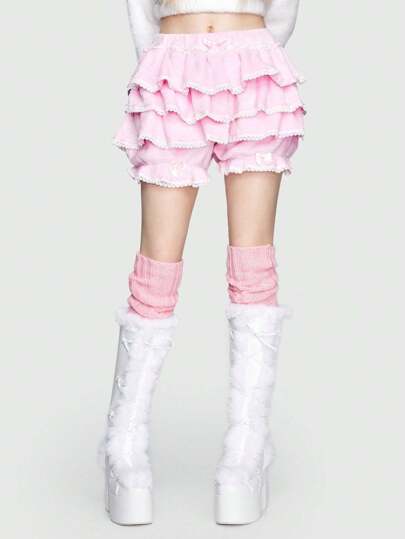 ROMWE Kawaii Layered Ruffle Trim Flannelette Shorts - Pink - View 1