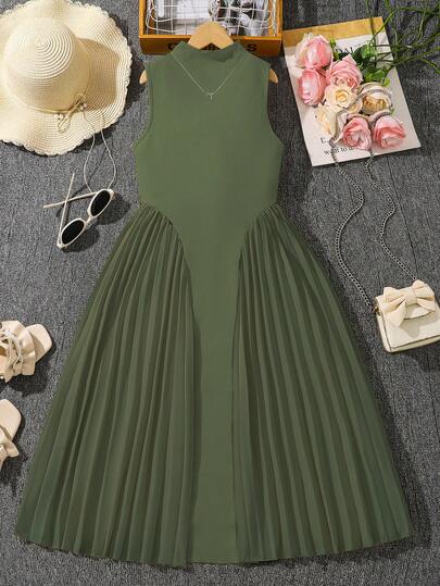 Left Mama Girls' Elegant Mandarin Collar Sleeveless Pleated Dress, Summer - Army Green - View 1