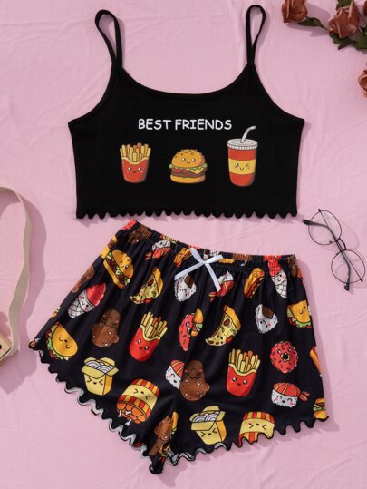 Letter & Cartoon Graphic PJ Set / Pajama Set - Black - View 6